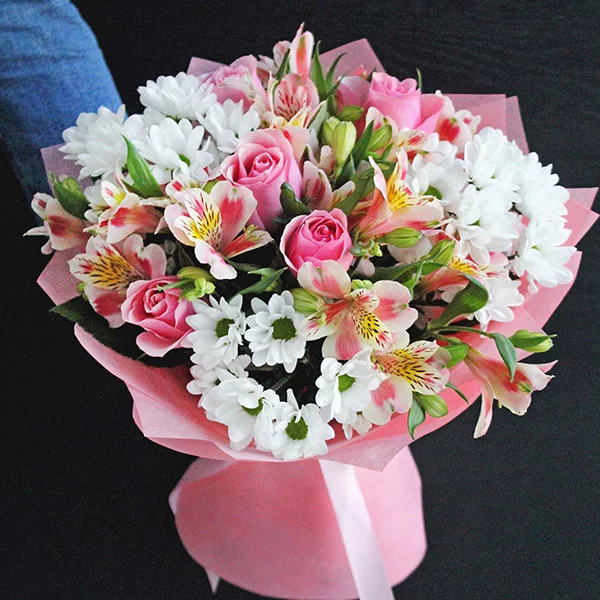 Стандартный (на фото): роза розовая - 5 шт., хризантема кустовая ромашковая белая - 3 шт., альстромерия розовая - 5 шт., фетр розовый, бант розовый.