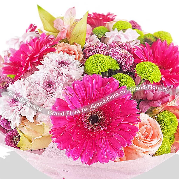 Стандартный: гербера малиновая - 5 шт., роза розовая - 3 шт., хризантема розовая - 3 шт., хризантема зеленая (сантини) - 2 шт., альстромерия - 2 шт., фетр розовый, бант розовый.