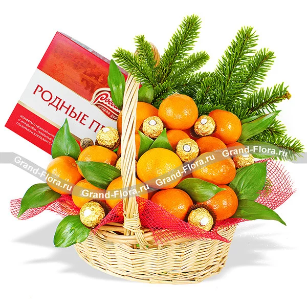 Стандартный: коробка конфет "Родные Просторы" (278 г.) - 1 шт., мандарины - 2 кг, набор конфет Ferrero Rocher (200г) - 1шт., зелень, еловая ветвь - 1 шт., сетка красная, корзина средняя.
