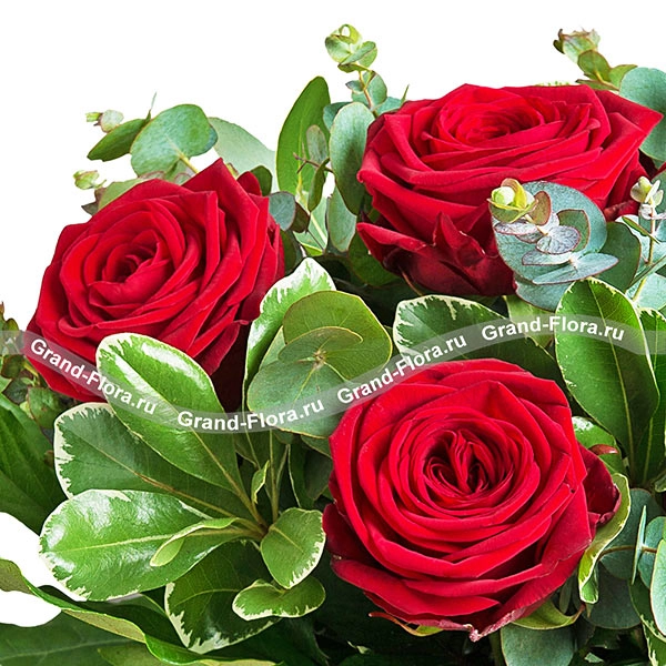 роза красная - 101 шт., рускус - 30 шт., эвкалипт - 20 шт., упаковка, бант красный.