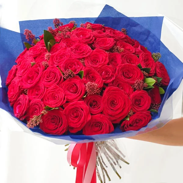 51 роз: роза красная - 51 шт., питтоспорум - 10 шт.,  упаковка, лента.